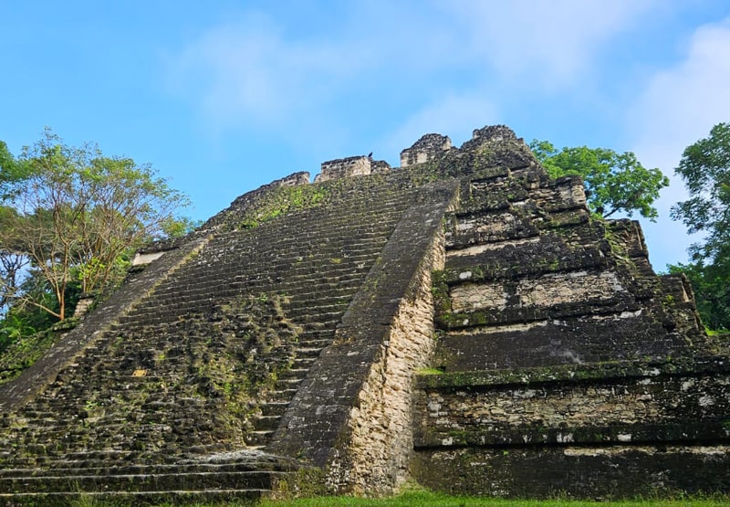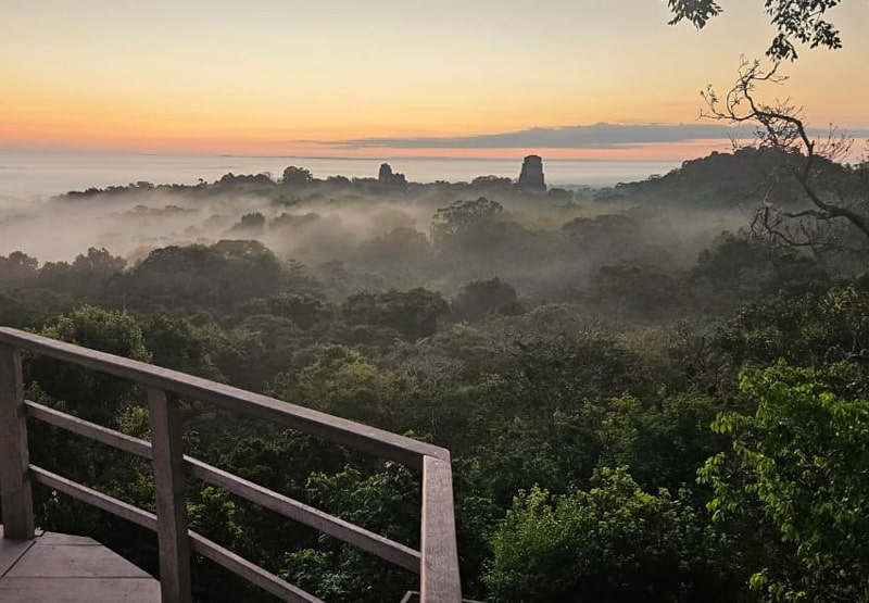 Al ascender la pirámide, te acompañará el coro de aves, monos y el murmullo de la vegetación despertando. Los primeros rayos de sol iluminando los antiguos muros mayas ofrecen una experiencia que trasciende lo visual. Importante mencionar que estamos en una selva tropical rodeados de vegetación y la neblina en cualquier momento se puede hacer presente.